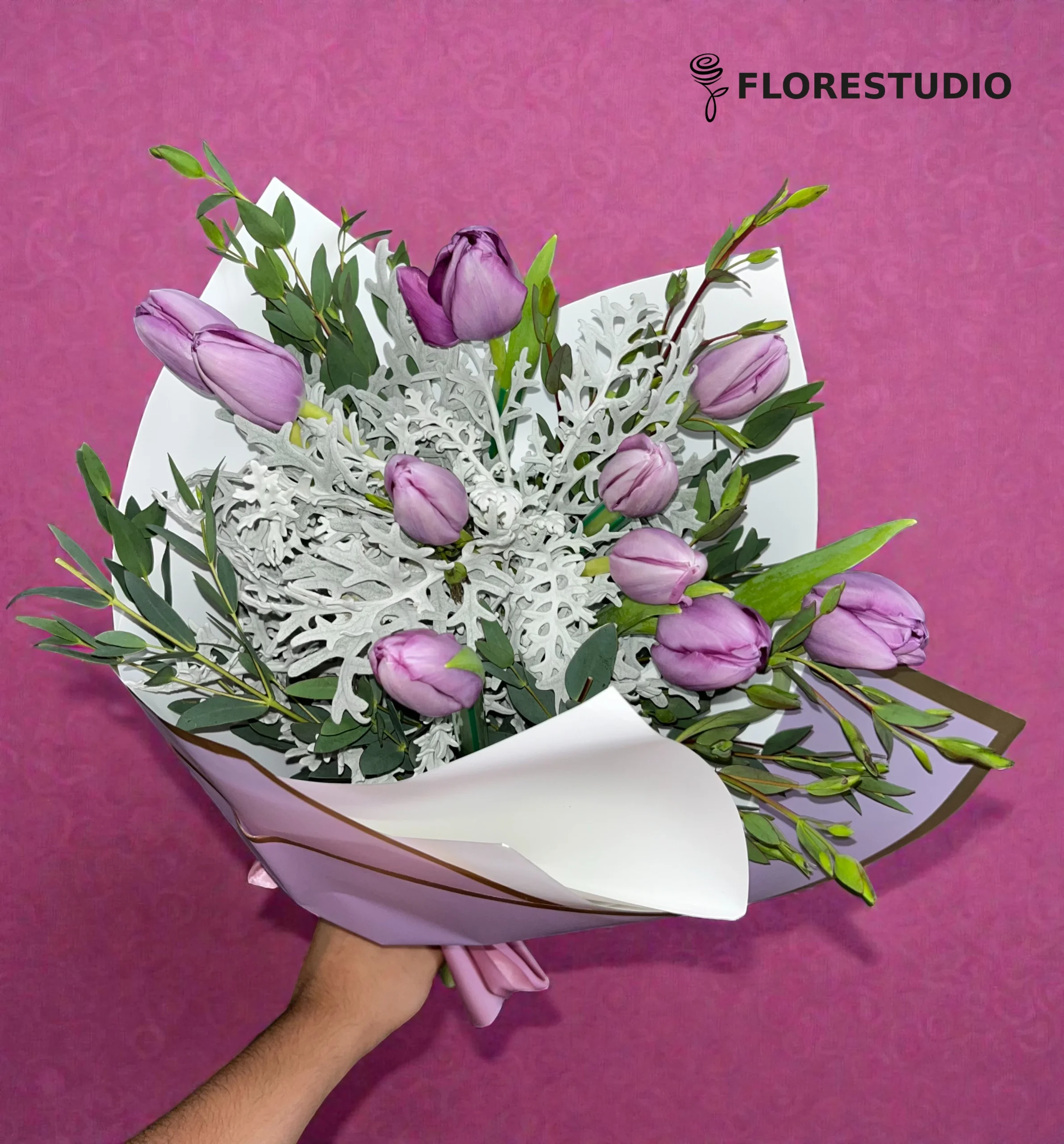 Ramo de 10 tulipanes morados acompañado de follaje premium y miller aserrado. Un diseño sofisticado que transmite elegancia, serenidad y buen gusto.