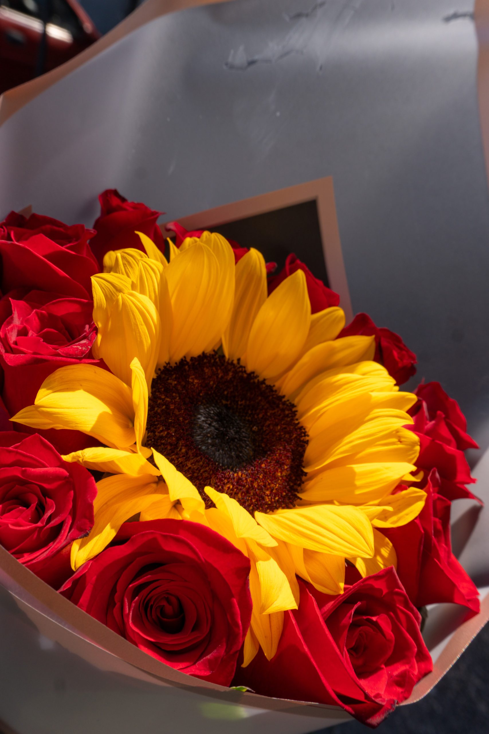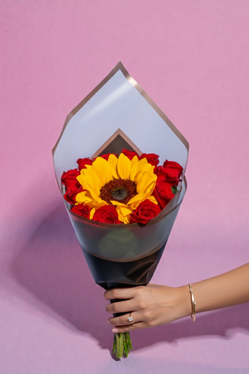 Un ramo que combina la intensidad de las rosas rojas con la luz y energía del girasol, creando un diseño armonioso, elegante y lleno de significado.