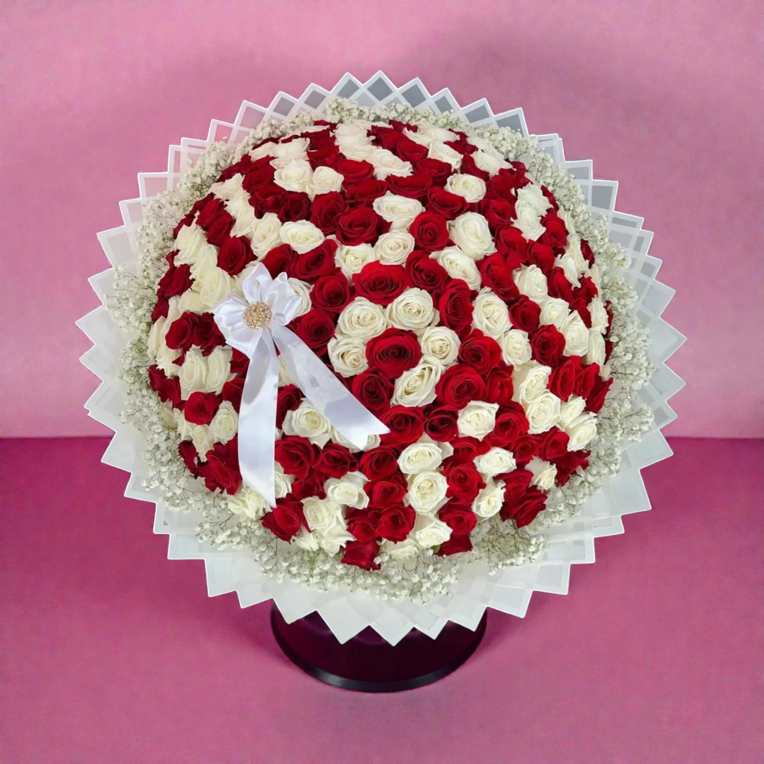 Ramo de 200 rosas blancas y rojas frescas con diseño elegante y gran impacto visual. Ideal para ocasiones verdaderamente especiales. 🌹🤍